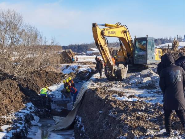 11月29日上午,東遼縣室外溫度達到零下13℃,但是高標準農田建設施工正火熱進行。在建安鎮4標段東壁村的施工現場,挖掘機傳出隆隆聲響,工人們在河溝中破冰施工,將裝好的石籠網箱按照要求埋入河底。