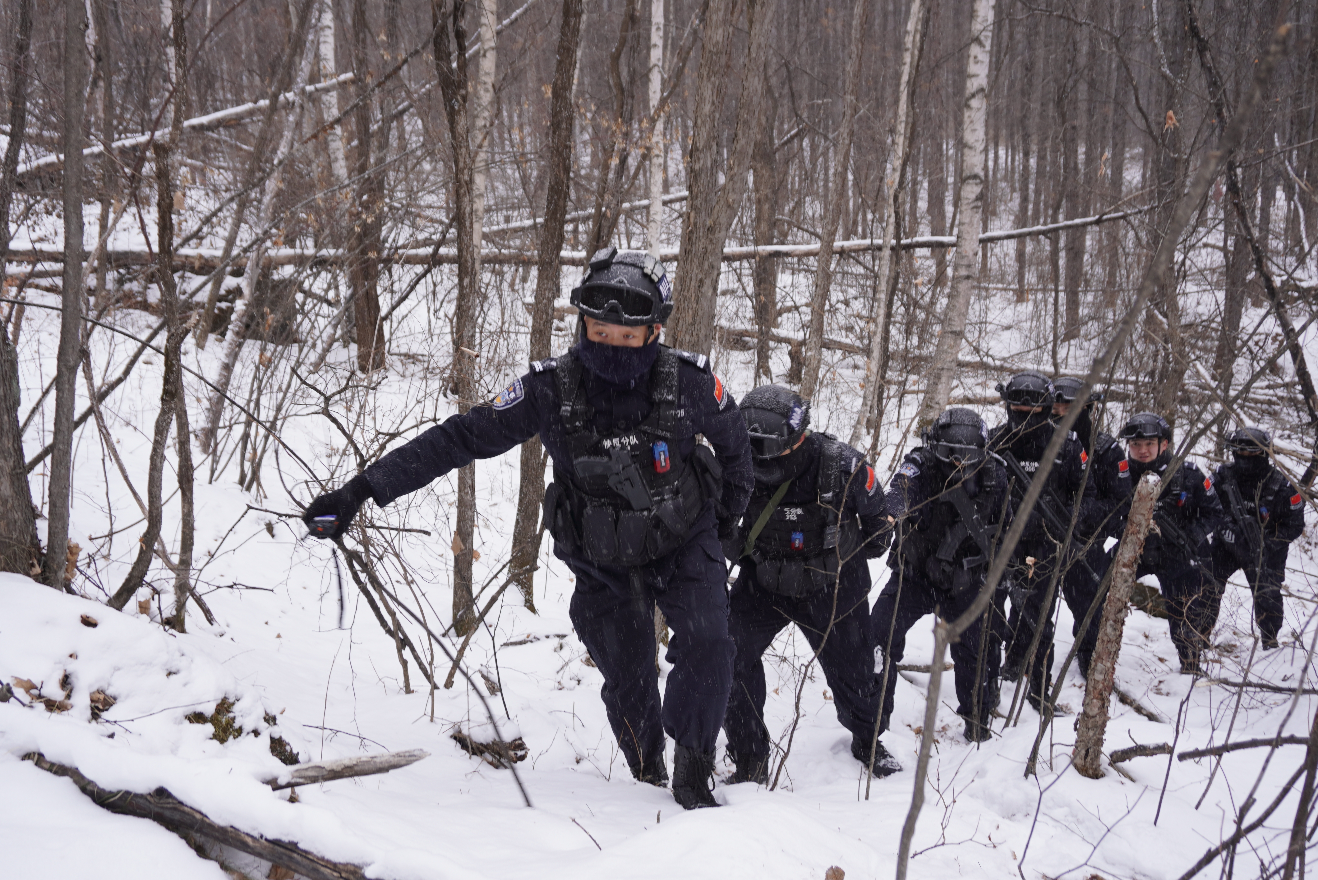 巡邏車行至山腳下,突降大雪,陡崖雪深,民警只能下車改為步巡。此時室外氣溫達零下23攝氏度,民警們的全身上下包裹得只露一雙眼睛,雪花很快飄落在頭盔上和衣服上,積了厚厚一層,隨著熱氣冒出,面罩、眉梢上也結(jié)上厚厚的一層冰霜。這樣的巡邏,民警們每次至少要走15公里,在室外長達4至6個小時。 “想要不冷就要一直走”。這是朱效賢巡邊多年總結(jié)出的工作“心法”,“這里最冷的時候氣溫接近零下40攝氏度,手機打開沒一會兒就凍關(guān)機了,人在這里只要待上10分鐘不運動,手腳就會凍得發(fā)麻了。” “報告,這里發(fā)現(xiàn)異常!”行進中,民警張文杰發(fā)現(xiàn)了一處不尋常的腳印,引起了大家的注意。