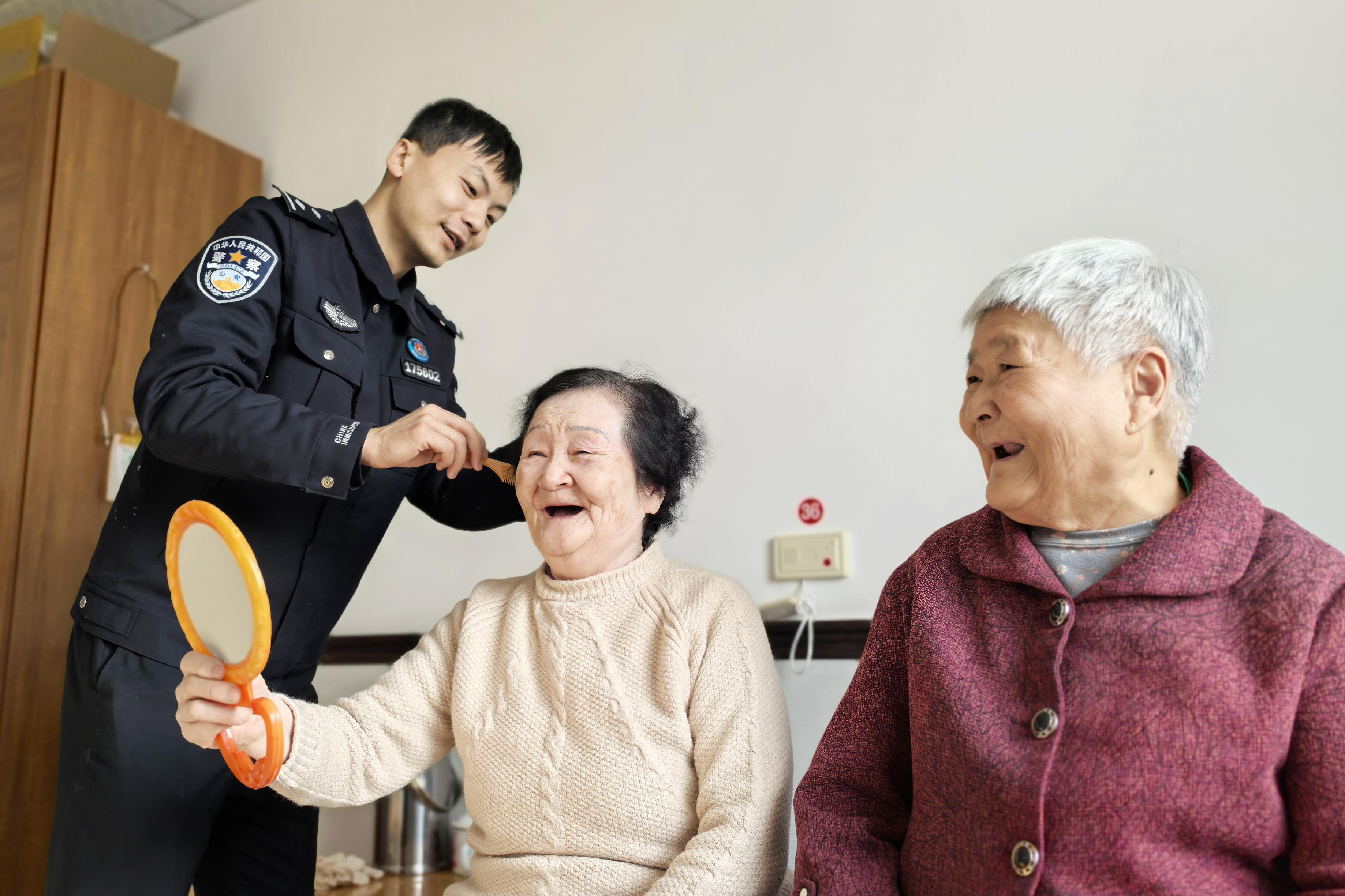 民警們一踏入敬老院,那原本略顯寂靜的院子瞬間熱鬧起來。幾名民警迅速拿起理發工具,搖身一變,成了貼心的“托尼老師”。他們目光里滿是溫柔,輕聲細語地詢問著老人的喜好:“大爺,您是想短一點清爽些,還是留長一點更顯精神?”得到老人的答復后,他們便熟練地操作著理發器,動作輕柔且流暢,碎發簌簌落下,每一個動作都飽含著對老人的關懷。剪完頭發的老人,看著鏡子里容光煥發的自己,臉上綻放出幸福的笑容,那笑容如同春日暖陽,驅散了冬日的寒意。 在生活區,為老人剪指甲的民警同樣全神貫注。他們輕輕握住老人那布滿老繭與皺紋的手,仿佛握住了歲月的痕跡。小心翼翼地修剪著指甲,每一下都拿捏得恰到好處,然后又仔細地打磨,動作輕柔得生怕弄疼老人分毫。還有的民警,坐在老人身邊,手指靈活地穿梭在老人的發絲間,為他們細心梳頭,一邊梳,一邊和老人們嘮著家常:“最近身體怎么樣?有沒有特別想吃的東西?”老人們打開了話匣子,講述著過去的故事,那些或平淡或精彩的過往,在民警們專注的傾聽中,仿佛有了新的生命力,歡聲笑語回蕩在敬老院的每一個角落。 在娛樂區,民警們和老人們圍坐在棋盤前,開啟了一場智慧的較量。雙方你來我往,落子有聲,每一步棋都深思熟慮。老人們精湛的棋藝讓民警們贊嘆不已,民警們也不甘示弱,積極應對。在這一來一往的切磋中,彼此的距離越來越近,沒有了年齡的隔閡,只有情感的交融。