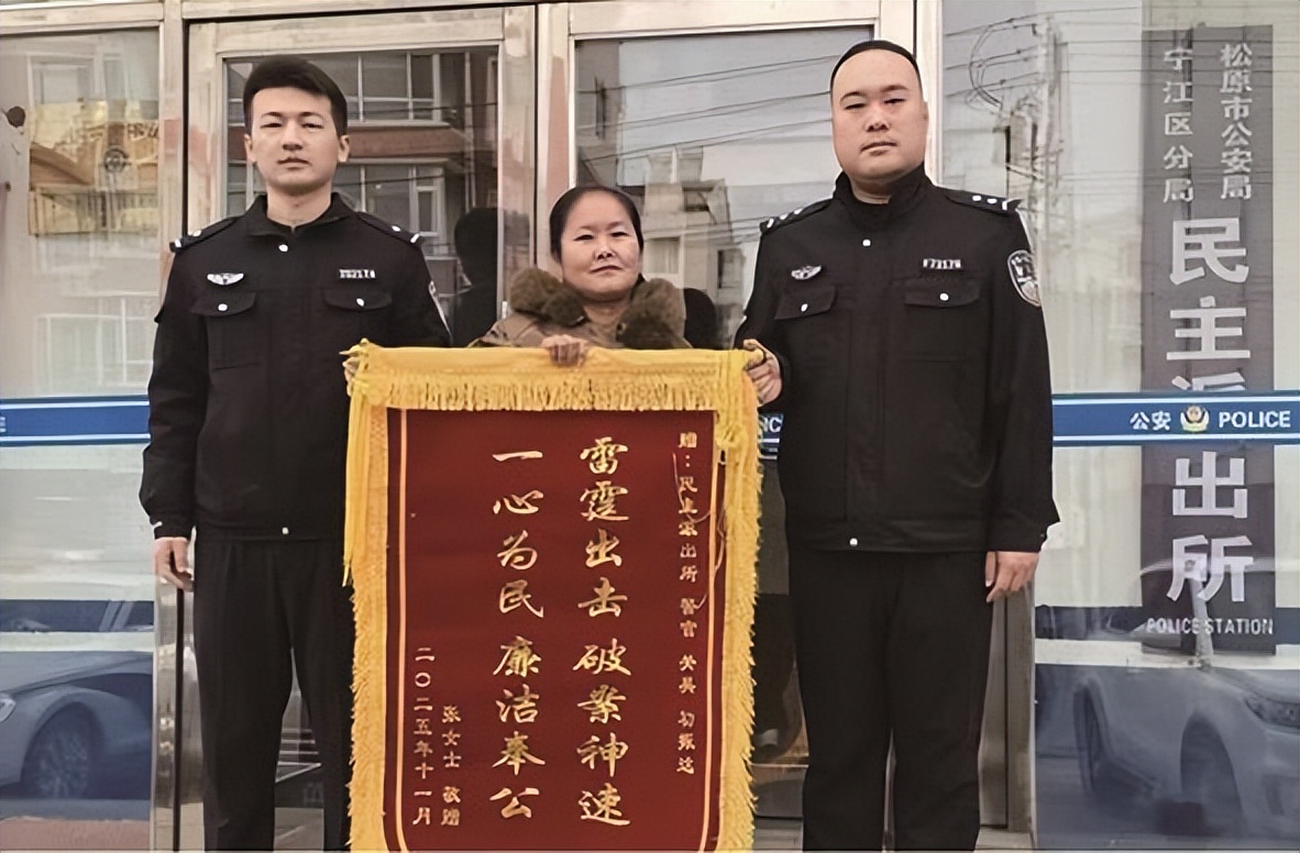 11月21日,居民張女士將一面錦旗送到松原市公安局寧江區分局民主派出所民警關昊、初振達手中,感謝民警幫助其快速找回遺失的手機。