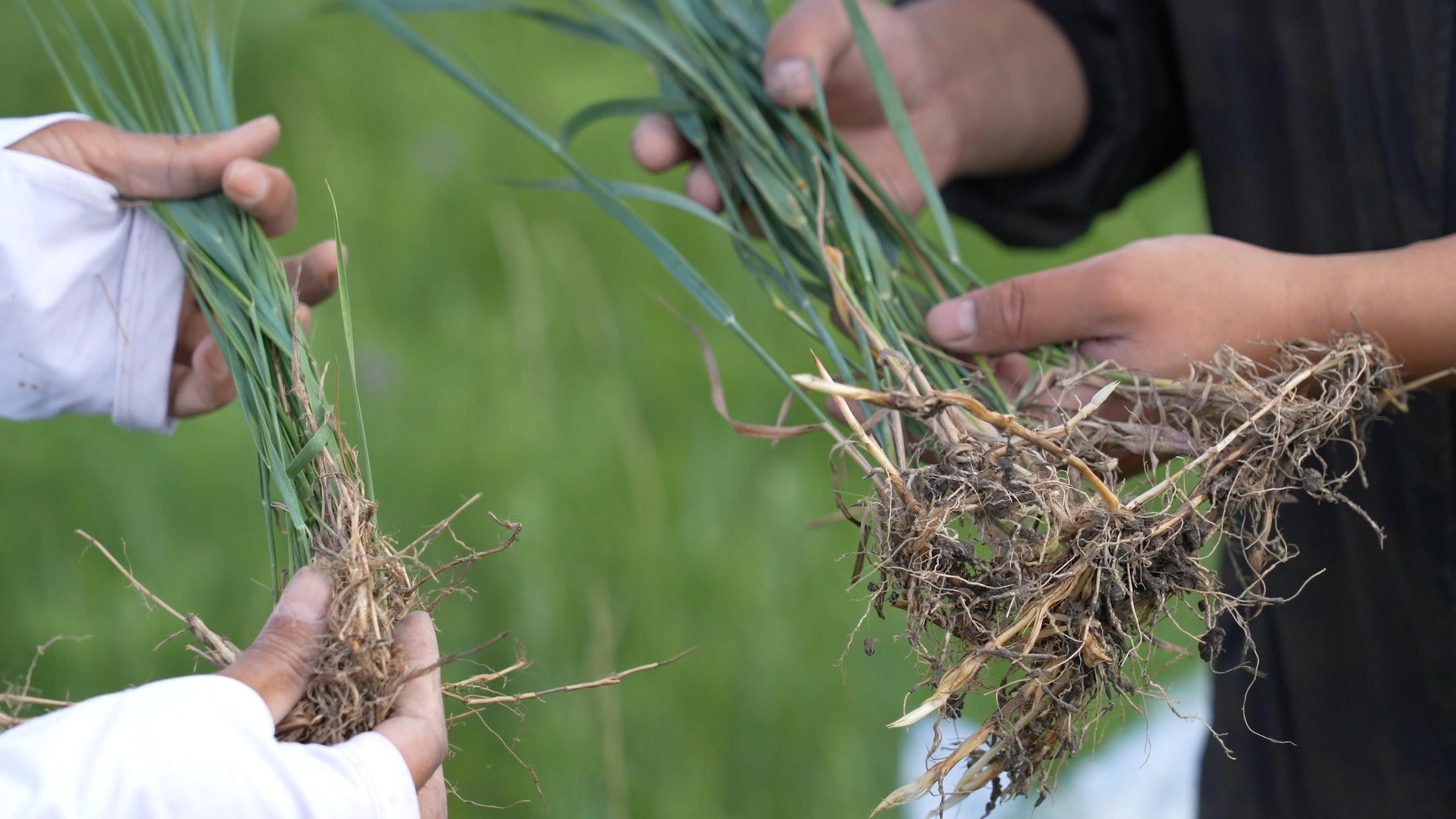 在白城市洮北區青山草場,科研人員頂著烈日,穿梭在茫茫草原上,篩選野生羊草種質資源。她們仔細查看羊草的長勢,測量株高、穗長,小心翼翼地將性狀表現優良的野生羊草挖出,輕輕去除根部土壤,認真查看根系狀況,隨后裝入袋中。每一個動作都充滿了專注與嚴謹,彰顯著對科研事業的執著與熱愛。 “你看這是羊草地下橫走的根莖,根莖最頂端的芽非常堅硬,它像一個先鋒,橫著向前生長,每生長一段根莖就會有一個芽點,芽點上就會長出新的羊草苗,然后它繼續往前走,再長出來,可以長到幾米長,這就是羊草的無性繁殖。”中國科學院東北地理與農業生態研究所研究員馬紅媛手中拿著一束羊草樣本在向記者介紹,“羊草的生命力非常頑強,地下根莖非常茂盛,可以起到快速擴繁防風固沙作用。”