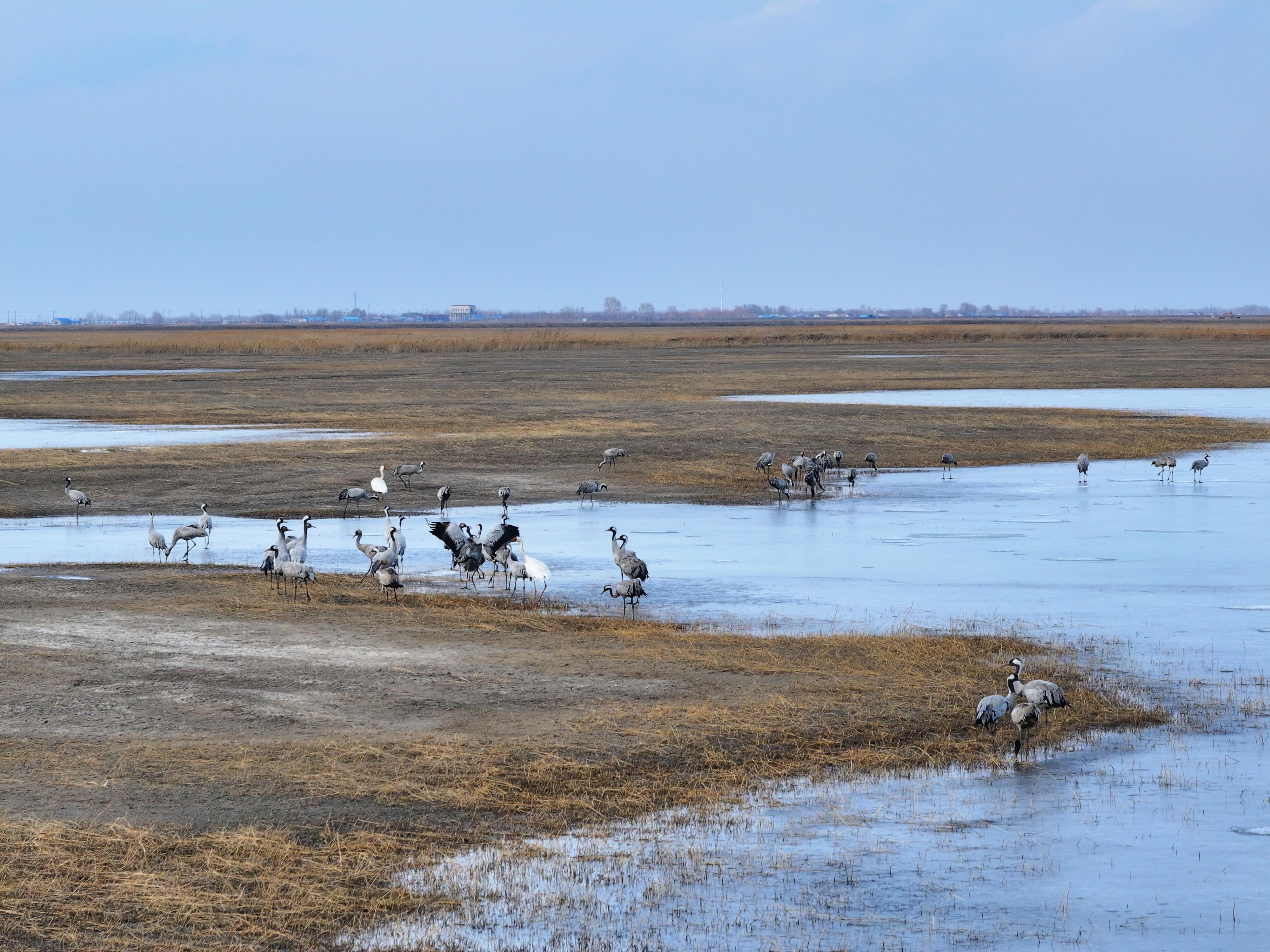 三月的春風掠過吉林白城黑土地,鎮賚縣二龍濤河流域奏響生命交響——3月12日,2只國家一級保護動物白鶴攜200余只灰鶴、豆雁等珍禽翩然而至,在泛著碎冰的淺灘上梳羽覓食,時不時在濕地上空舒展翅膀、歡快鳴叫,東方白鸛也在鶴群上空現身,拉開全球最大白鶴種群春季停歇的序幕。作為候鳥遷徙通道的"黃金中繼站",這片濕地正以五星級生態服務迎接跨越萬里的"天空舞者"。 鎮賚縣不僅是全球最大的白鶴種群遷徙停歇地,也是國內公認的最佳白鶴觀測地之一。監測數據顯示,當地每年春秋兩季在這里停歇的白鶴超過4000只,白頭鶴超過1800只,灰鶴數量超過5000只,東方白鸛最高停歇記錄超過2000只,而此次鶴群的“先遣”抵達,預示著以白鶴、東方白鸛為代表的大批珍稀候鳥即將接踵而至。